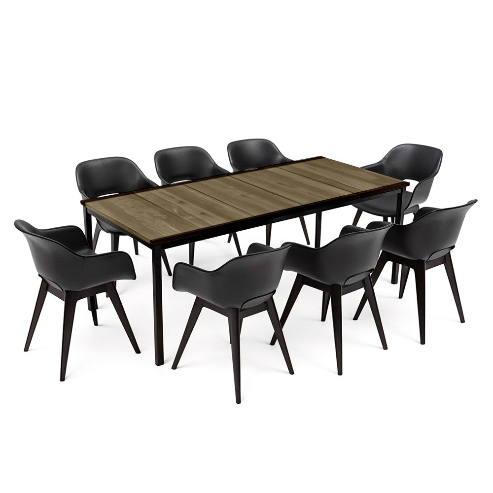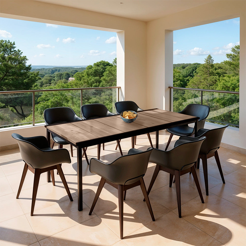A meleg, természetes kőris tónusú asztallap és a hűvös grafit székek kontrasztja minden stílusú kültéri térben magára vonzza a tekintetet: skandináv, mediterrán vagy ipari környezetben is kifinomult megjelenést ad.