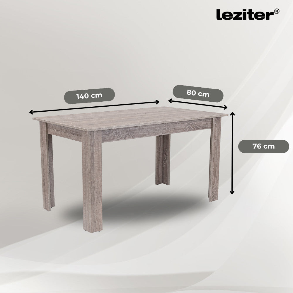 A Leziter Leon 6 személyes étkezőgarnitúra mindent tud, amit egy modern, megbízható bútortól elvársz. Az asztal strapabíró, yorki tölgy bútorlapból készült, mérete 140x80x76 cm, így közepes helyiségekbe is tökéletesen illeszkedik, miközben kényelmes teret biztosít a közös étkezésekhez. A lapra szerelt kivitel gyors, egyszerű összeszerelést tesz lehetővé, a fém sarokmegerősítések pedig garantálják a stabilitást és a hosszú élettartamot.