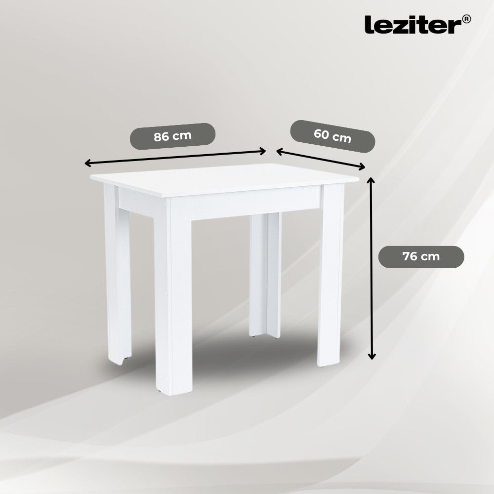 A Leziter Leon 4 személyes étkezőgarnitúra mindent tud, amit egy modern, megbízható bútortól elvársz. Az asztal strapabíró, fehér bútorlapból készült, mérete 86x60x76 cm, így kisebb helyiségekbe is tökéletesen illeszkedik, miközben kényelmes teret biztosít a közös étkezésekhez. A lapra szerelt kivitel gyors, egyszerű összeszerelést tesz lehetővé, a fém sarokmegerősítések pedig garantálják a stabilitást és a hosszú élettartamot.