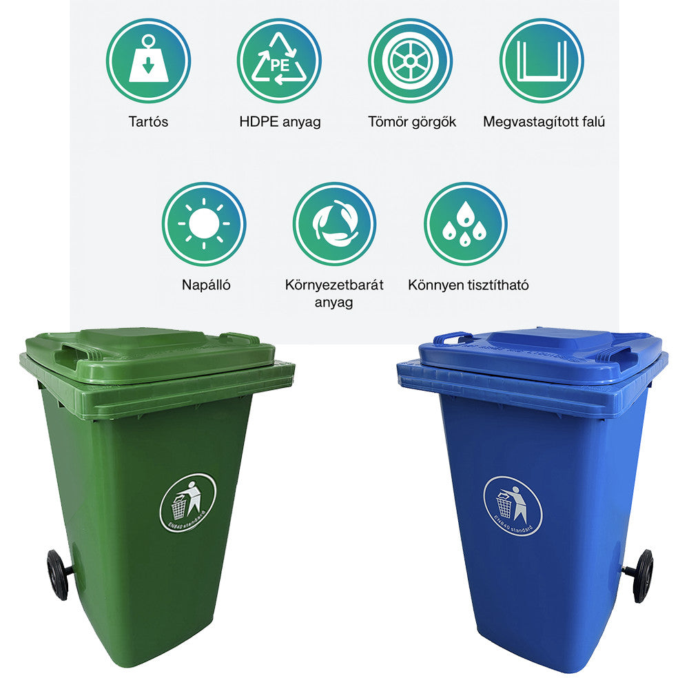 Kommunális kerti hulladéktároló 120 l űrtartalommal, fedéllel és kerekekkel.