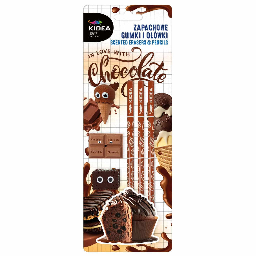 Illatos írószer, suli szett, 6 db-os, csokoládés, Kidea Tartalma: 3 db HB ceruza és 3 db illatos, különbözõ formájú radír. Ezek az írószerek feldobják a tanulást!