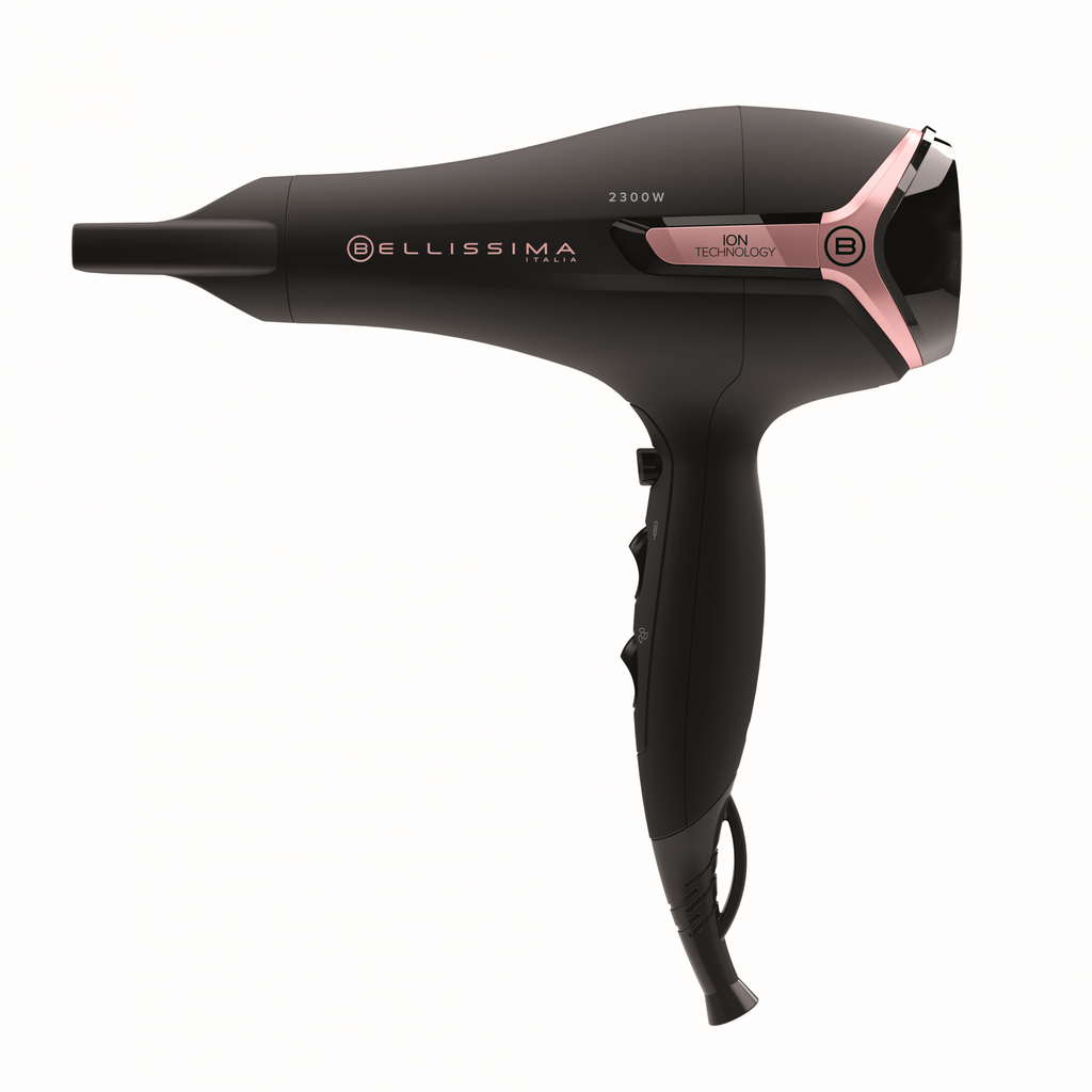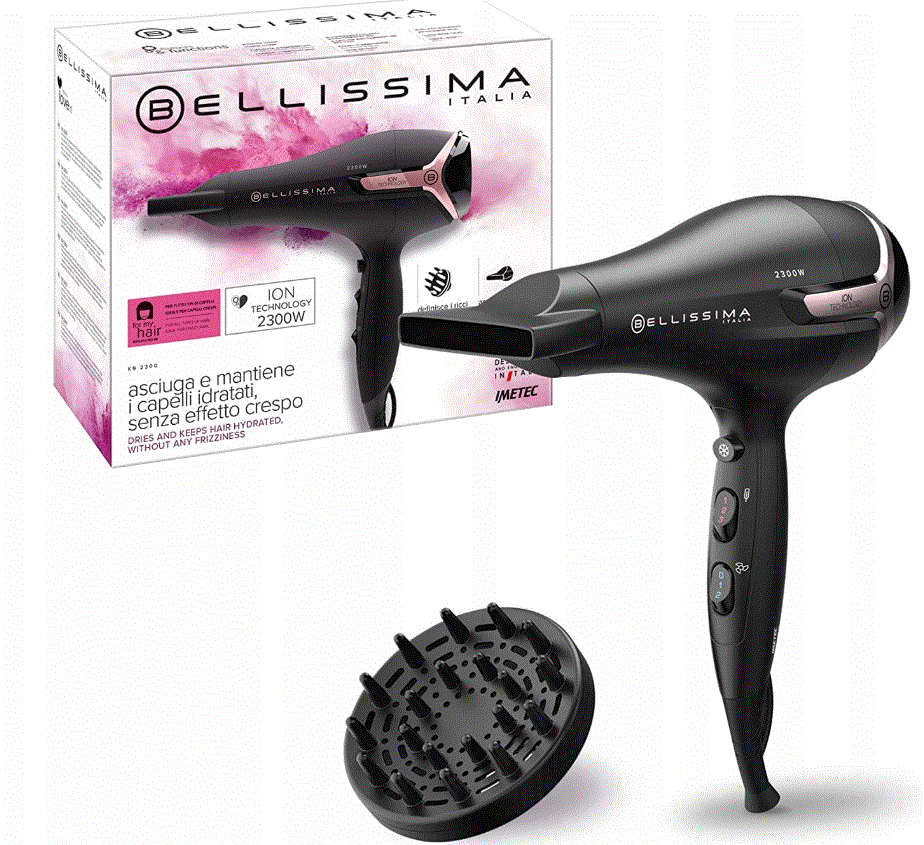 Bellissima hajszárító - 2300 Watt - DC motor - ion technológia - 1 szűkítő és 1 diffúzor tartozék - 2 sebességfokozat - 3 hőmérsékletfokozat - 8 levegőáramlás/hőfok kombináció - hideg levegő - levehető szűrő - függesztő hurok - 1,8 m vezetékhossz