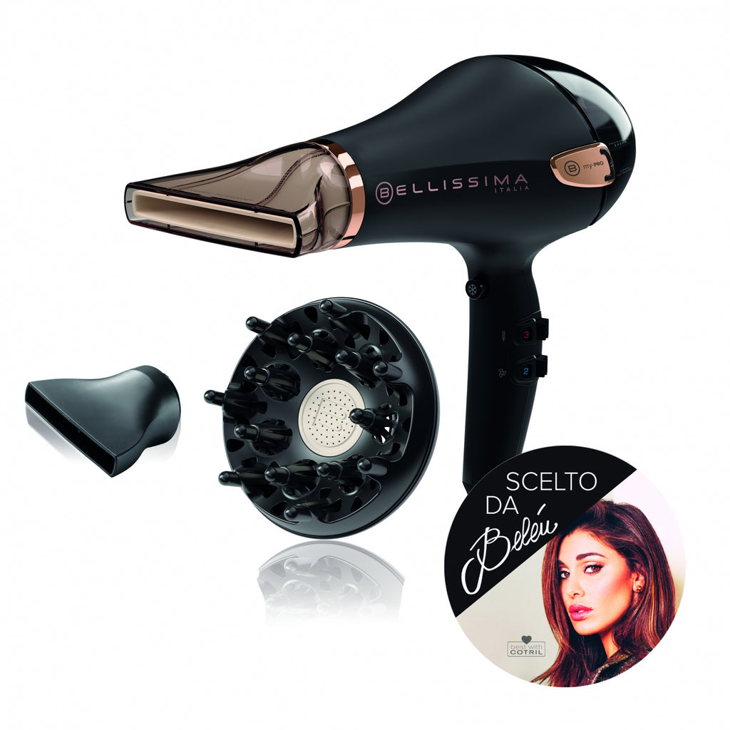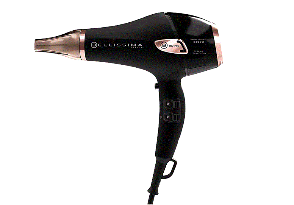 Bellissima My Pro kerámia hajszárító - professzionális AC motor - 2300 W teljesítmény - iontechnika - zajcsökkentő technológia - ultrateljesítményű levegőrendszer - működési led - 2 sebesség, 3 hőmérséklet - hideglevegő gomb - kivehető szűrő - professzionális kábel 3m