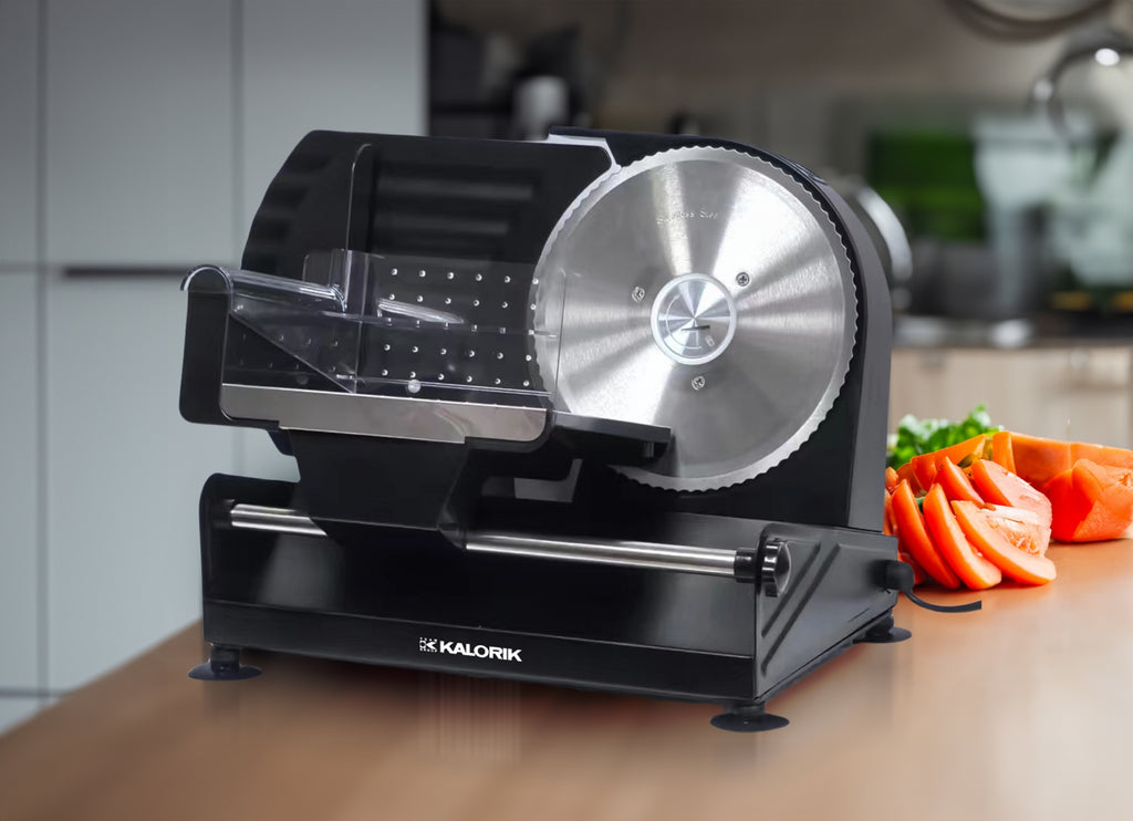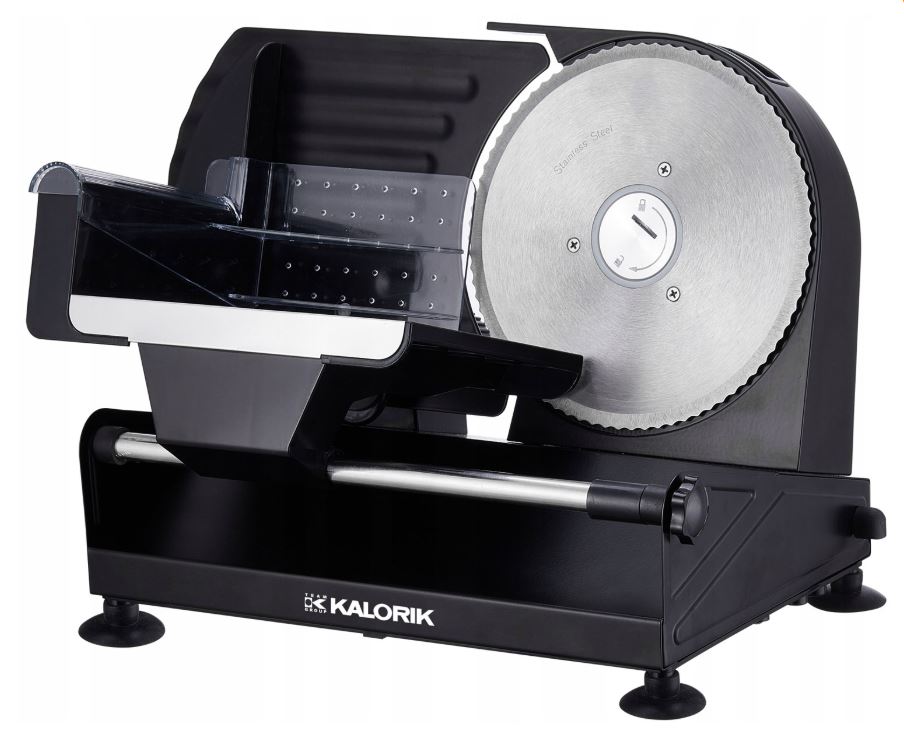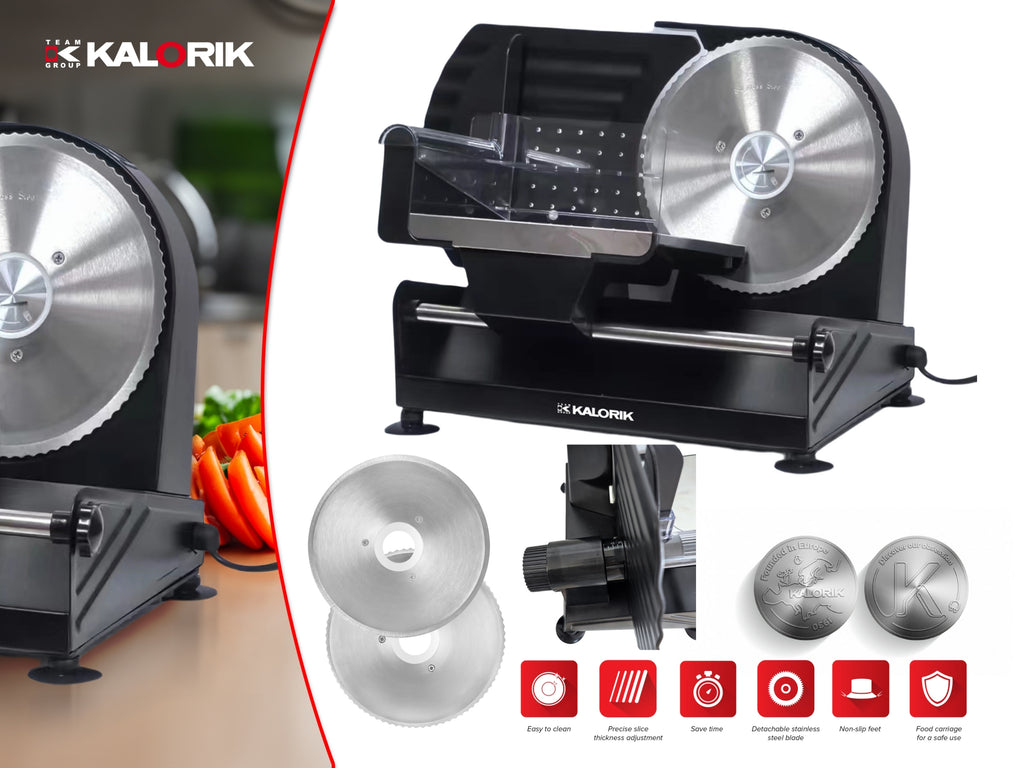 Tökéletes kenyér, hús, sajt, szalámi, kolbász és még sok más szeletelésére Csúszásmentes lábak a stabilitás érdekében A támasztóasztal, a kézvédő és a biztonsági kapcsoló biztonságos felhasználást biztosít Biztonsági zár a kés cseréjéhez, vagy tisztításához Levehető vágókorong, rozsdamentes acélból Adagolólap rozsdamentes acél Alumínium ház Penge átmérője: 19 cm Állítható vágási vastagság: 0-15 mm Az átlátszó élelmiszer-tartó vágásvédelmet biztosít 1db extra penge, finom szeleteléshez Teljesítmény: 150 W Zajszint: < 76 dB