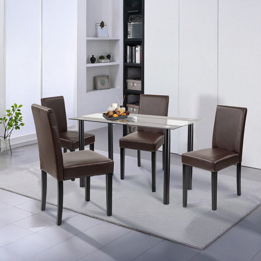 A szett négy darab Leziter Kelly széket is tartalmaz, amelyek barna ECO bőr kárpitozással készültek. Az elegáns megjelenés mellett ezek a székek rendkívül könnyen tisztíthatók. A 4 cm vastag habszivacs ülőfelület hosszabb étkezések során is komfortot nyújt, a stabil fenyőfa lábak pedig 120 kg teherbírással garantálják a hosszú távú megbízhatóságot.
