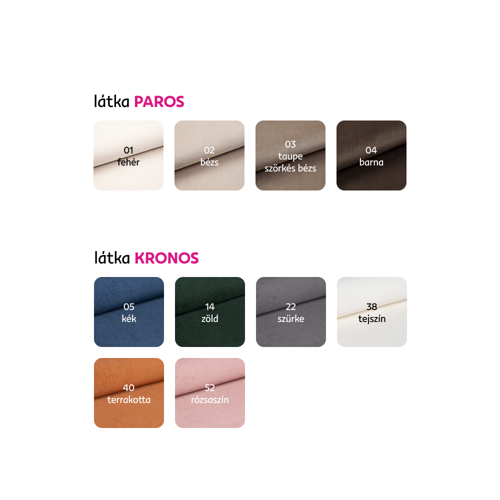 Megrendelhető a Paros szövet 4 színváltozatában és a Kronos szövet 6 színváltozatában ár: 302 500 Ft., 6-8 hetes szállítási idővel. Egyedi rendelés esetén a teljes összeg 20%-át előlegként szükséges befizetni. Az előleg befizetése után a rendelés gyártásba kerül.