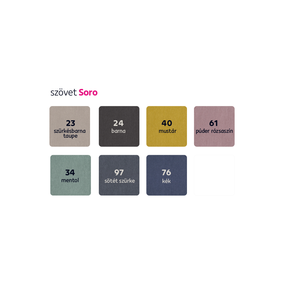 A kanapé a Soro szövet 7 színváltozatában megvásárolható ár 522 500 Ft. Egyedi megrendelés esetén az összeg 20%-át előlegként szükséges befizetni. Az előleg befizetése után a megrendelése gyártásba kerül. A szállítási idő 6-8 hét.