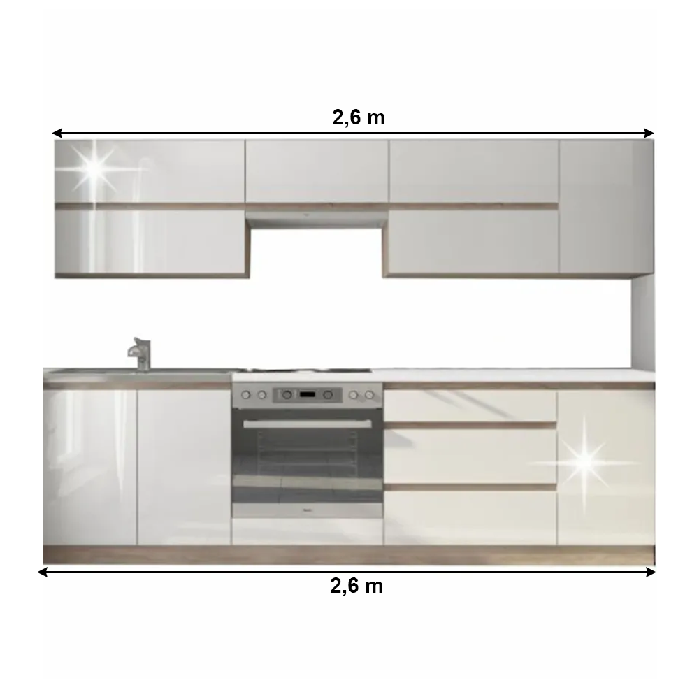 Alapkonyha: a váz DTD laminált sonoma tölgyfa, ajtók - , vagy a váz fehér magasfényű HG DTD laminált fehér/ajtók sonoma tölgyfa. Felső méret a füstelszívó szekrénykével: 2,6 m, alsó méret: 2,6 m,