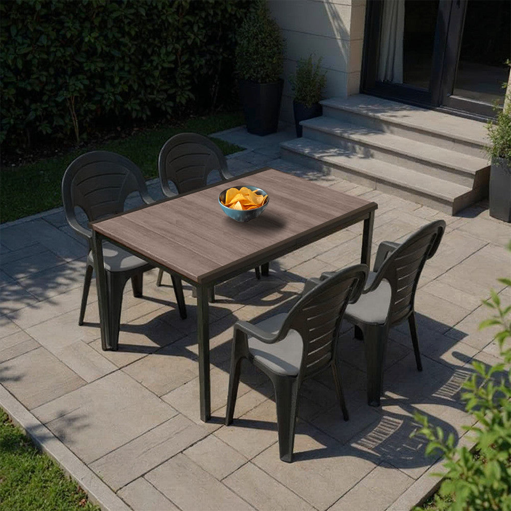 A Lagos 4 + 1 kerti szett asztallapja – a Porto 160 modell – DecoCoat™ eljárással készült, fahatású polimerből. Ez a speciális, UV-stabilizált műanyag nem szívja magába a vizet, nem vetemedik, és a nyári forróság vagy a téli fagy sem tesz benne kárt. Az asztallapot egy porszórt, korrózióálló fémváz merevíti, így egyszerre kapod meg a természetes megjelenést és az acélos tartósságot.