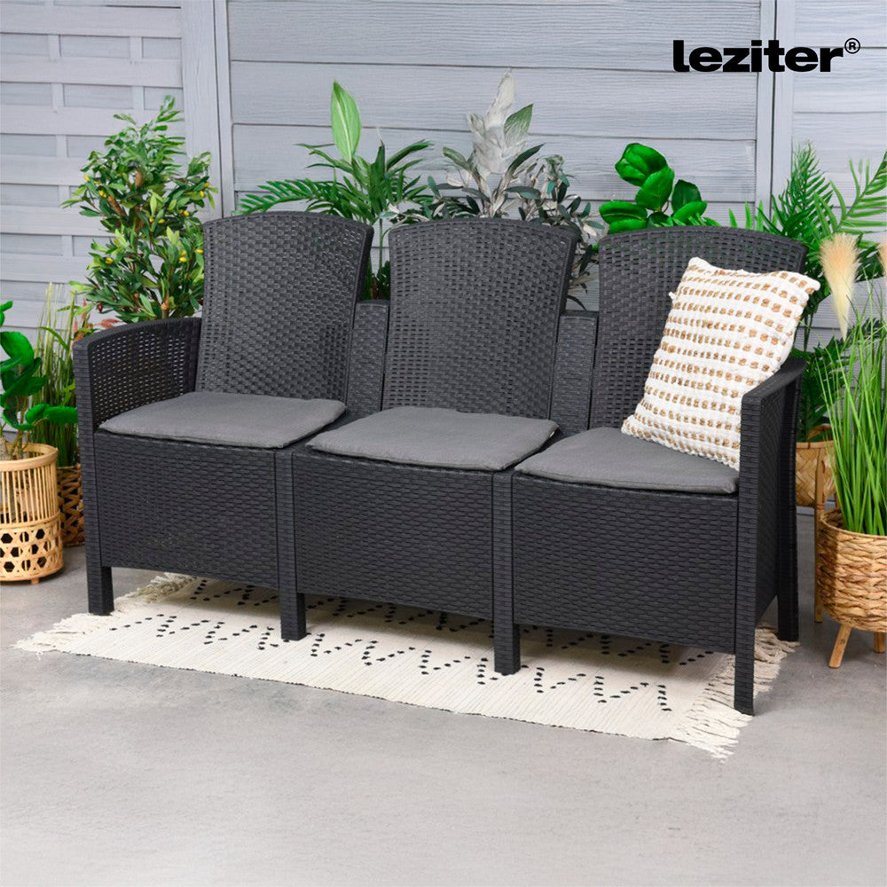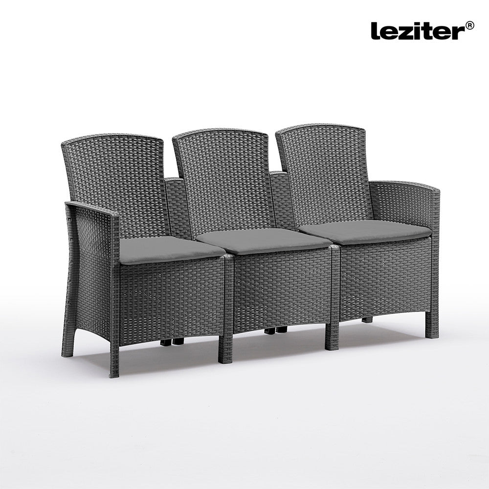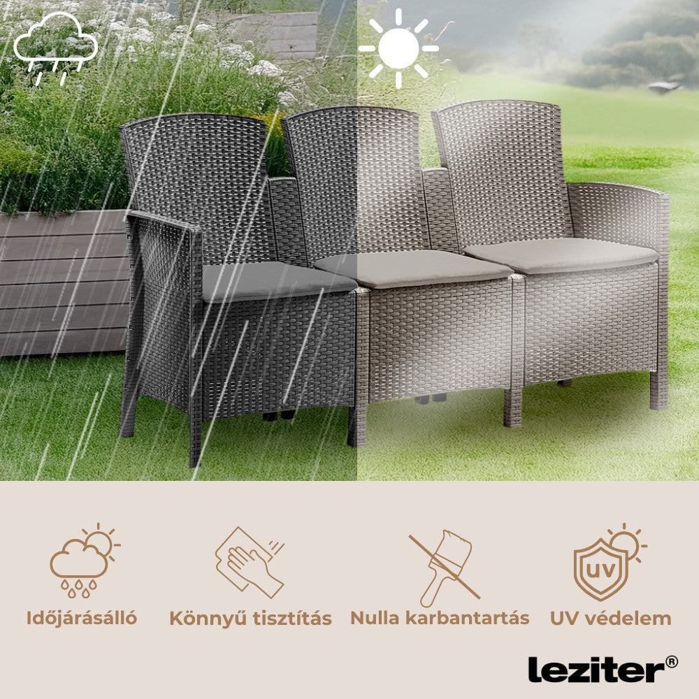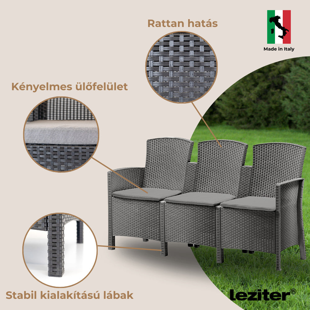 A grafit szín és az eredeti rattan hatású textúra miatt ez a kanapé könnyedén illeszkedik modern és klasszikus stílusú kertekbe, teraszokra vagy akár éttermi területekre is. Kompakt mérete (167 x 59 x 90 cm) lehetővé teszi, hogy kisebb teraszokon is jól mutasson, miközben elegendő helyet biztosít a kényelmes ücsörgéshez.