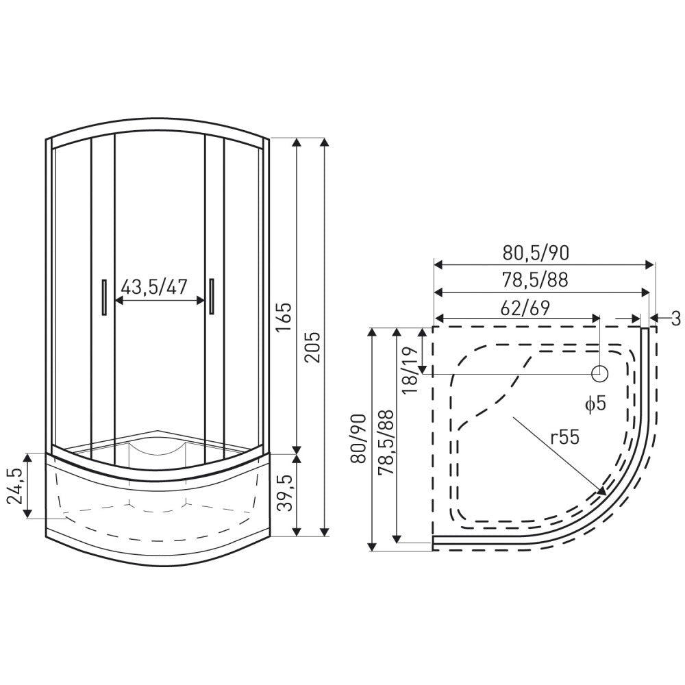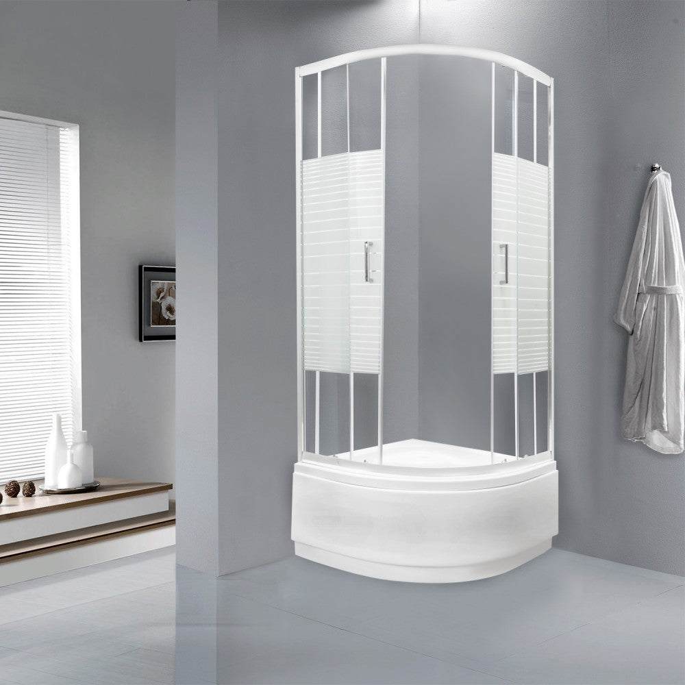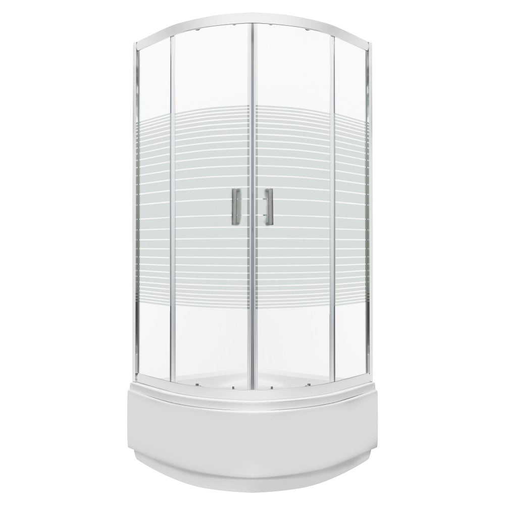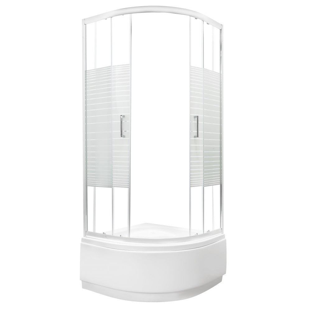 A zuhanykabin 4 mm-es edzett víztiszta, fehér csíkokkal díszített biztonsági üveggel van ellátva.A zuhanykabin íves kivitelben kapható. Dupla görgős ajtókkal van ellátva. Emellett a csomag részét képzi egy méretben passzoló mélyített akril zuhanytálca is, így ezt nem nem kell külön beszereznie a vásárlást követően. A mélyített akril tálca tökéletes kisgyermekek mosdatására is. A kabin 90,5x90,5x205 cm méretű. A zuhanytálca 90,5x90,5x39,5 cm méretű. 50 mm-es szifon szükséges hozzá (nem tartozék!).