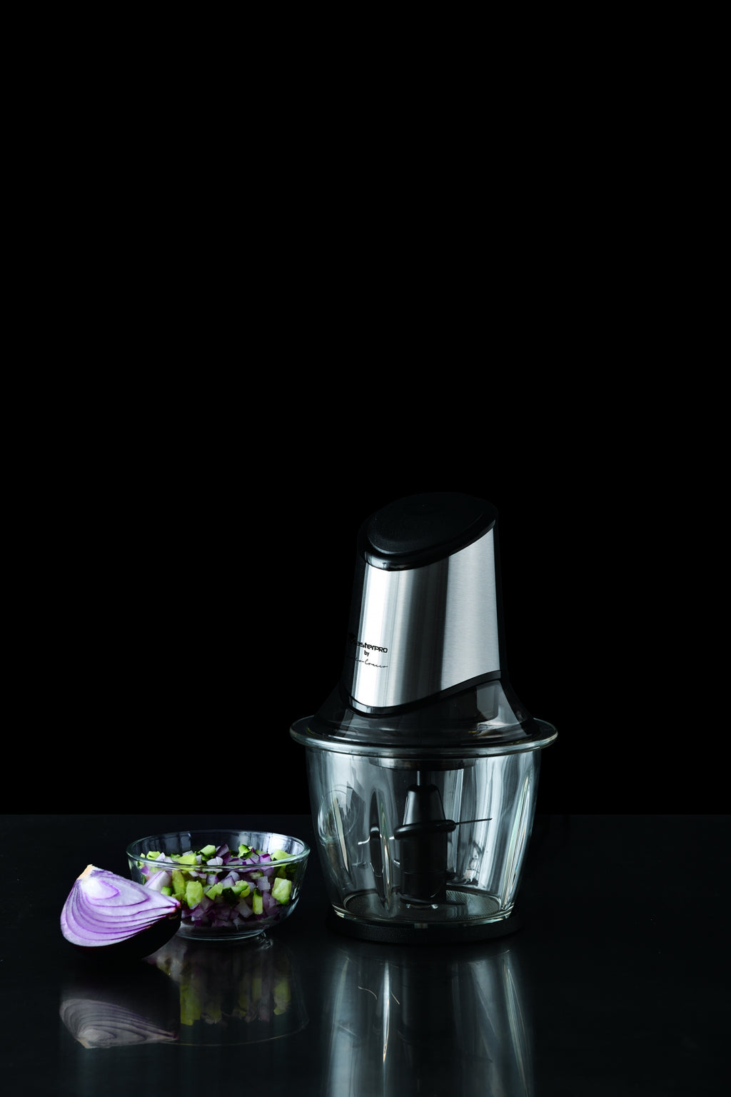 Teljesitmény 400W-1,2L-es üveg kehely-Rozsdamentes acél, kivehető S alaku pengék-3 funkció : apritás,darálás,mixelés- és keverő szár-Rozsdamentes acél géptest-Csúszásmentes talp-Carlo Cracco olasz mesterszakács ajánlásával