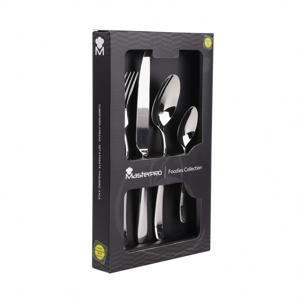 4 darabos evőeszközkészlet, amely 1 kanálból, 1 késből, 1 villából és 1 desszertkanálból áll. A Masterpro komplett modern evőeszközkészleteket kínál rozsdamentes acélból, fényes kivitelben. A rozsdamentes acél természeténél fogva korrózióálló anyag, amely az évek során is jól megmarad.