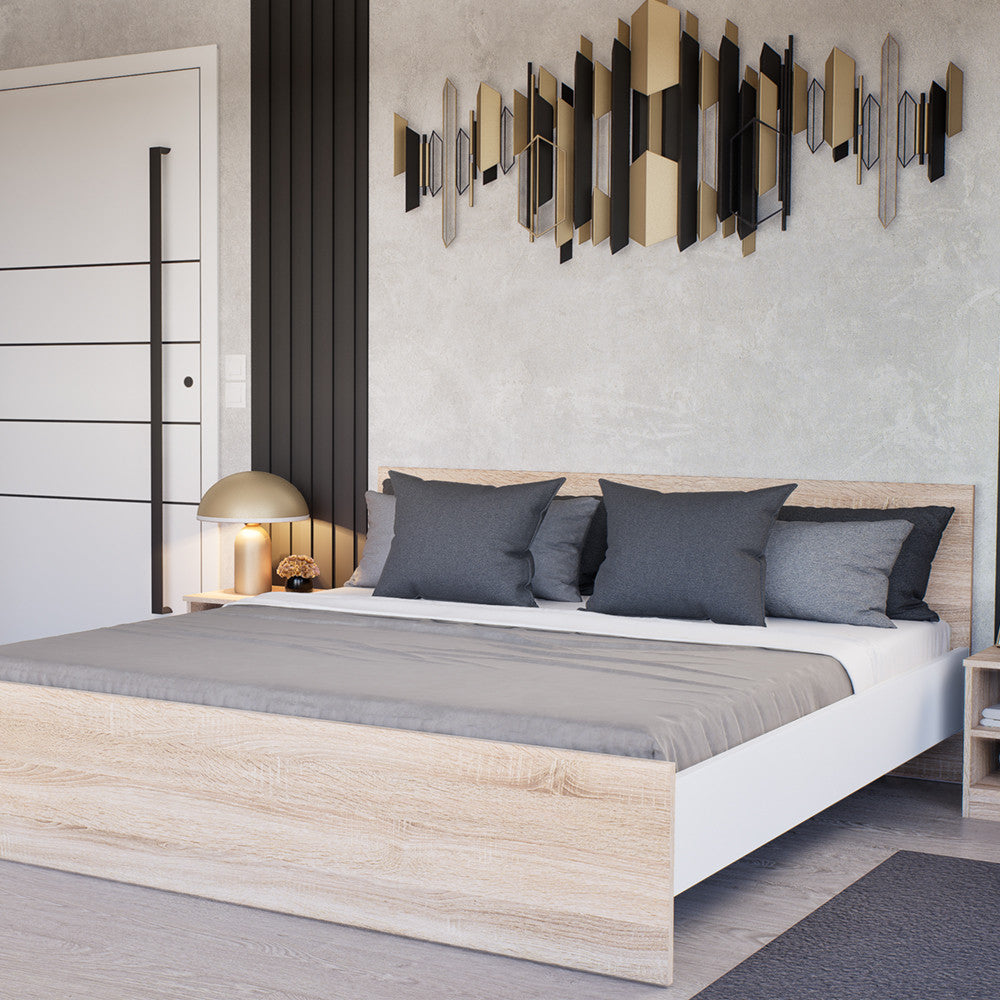 A miami ágy kiváló minőségű bútorlapból készült, fehér oldallappal, sonoma tölgy fejvéggel és ágyvéggel. Az ágykeret méretei: 205 x 165 cm. Az ágytámla méretei: 80 x 185 cm. Az ágykeretbe illő matrac méretei: 200 x 180 cm