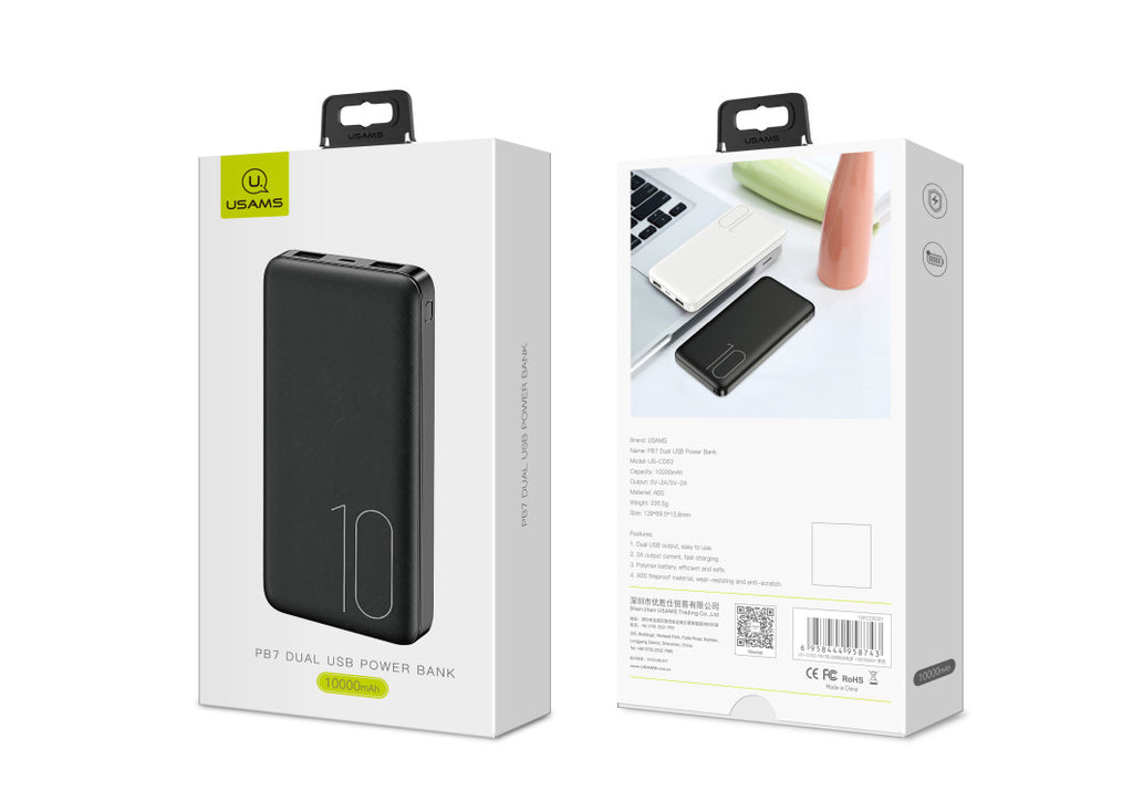 10.000mAh teljesítményű powerbank 2 usb porttal. Kompatibilis minden készülékkel, melynek töltése usb portton keresztül történik. Egyszerre két készülék is tölthető vele egyidőben a 2, különálló USB portnak köszönhetően. Nagy teljesítményű külső akkumulátor, egy átlagos mobiltelefont 5-6 alkalommal lehet teljesen feltölteni a vele. Mindkét usb portton keresztül 2A töltést ad le.