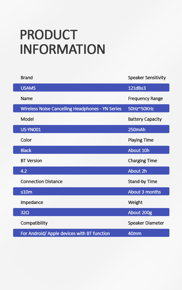 USAMS vezeték nélküli Bluetooth fejhallgató aktív zajszűréssel BT4.2.